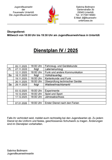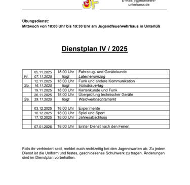 Wir treffen uns immer mittwochs von 18:00 Uhr bis 19:30 Uhr, um den Ausbildungsdienst durchzuführen. Weitere Infos können dem Dienstplan entnommen werden.
