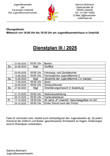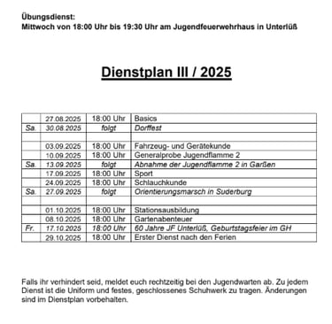 Wir treffen uns immer mittwochs von 18:00 Uhr bis 19:30 Uhr, um den Ausbildungsdienst durchzuführen. Weitere Infos können dem Dienstplan entnommen werden.