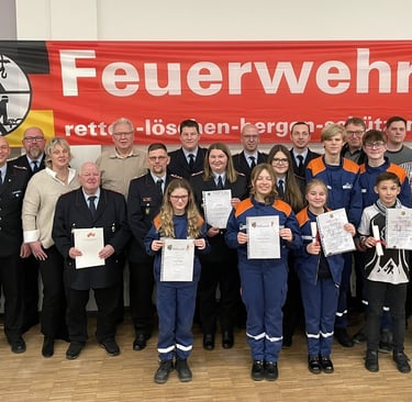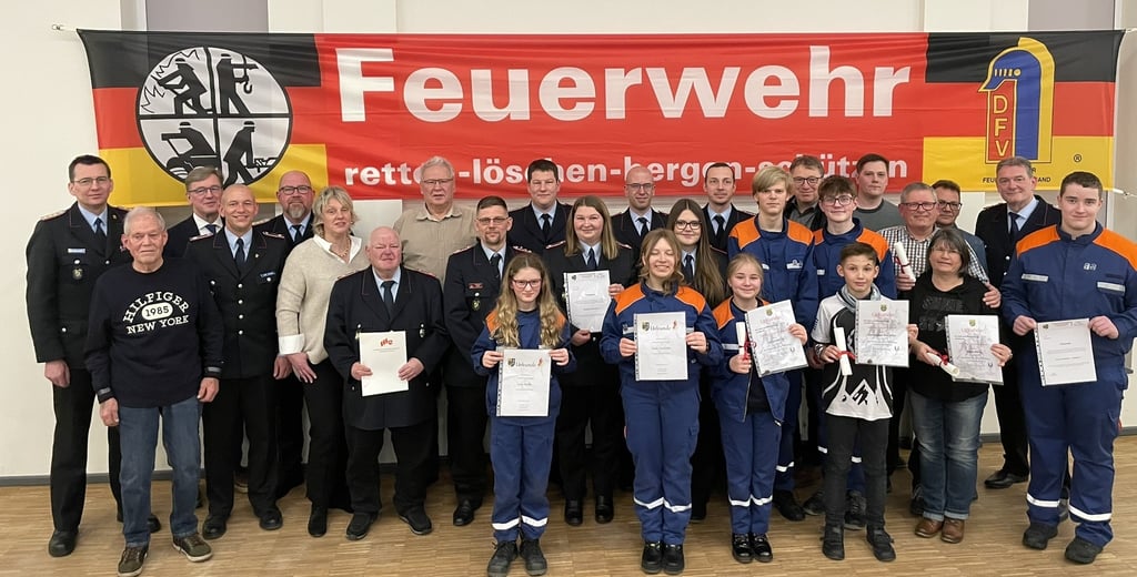 Auch einige Ehrungen und Beförderungen standen für den Abend auf dem Programm. So konnte der Ortsbrandmeister Hufenbach die Mitglieder Lucien Brandes, Colin Stahl und Niklas Glandt zu Feuerwehrmänner-Anwärtern ernennen. Henrik Wenzel wurde zum Feuerwehrmann und Leonie Koslowski zur Feuerwehrfrau befördert.
